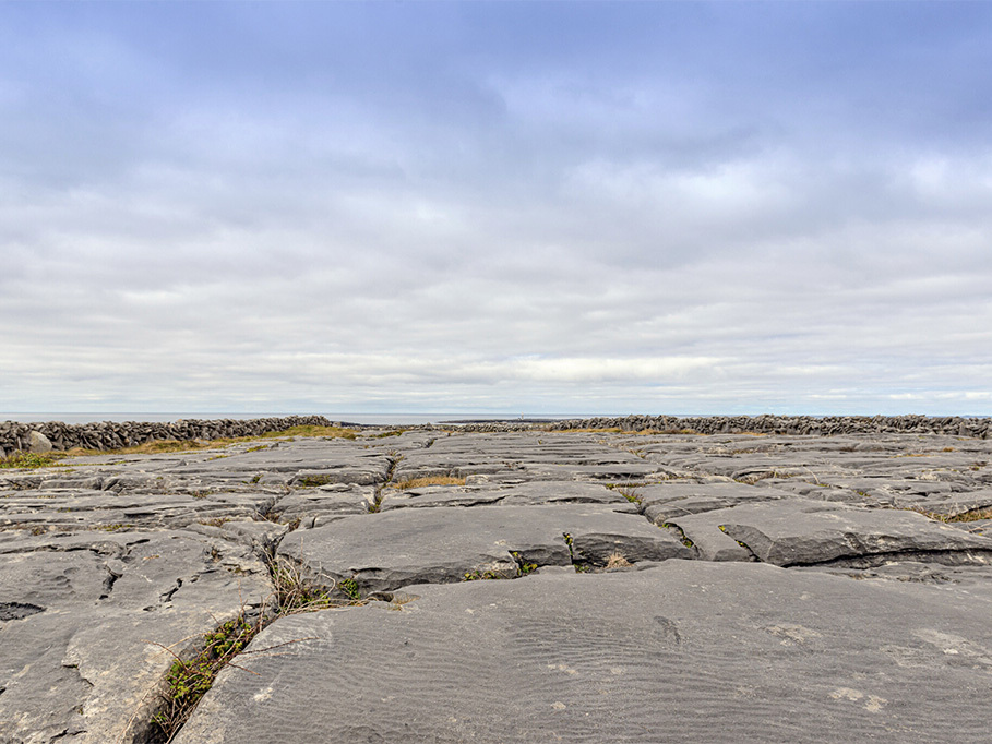 Much of the limestone surface on Aran is karst — bare rock largely devoid of soil. Limestone contains calcium carbonate, which can be slowly dissolved by rainwater that has absorbed carbon dioxide, forming a weak carbonic acid. Over time, this rainwater attacks exposed rock along joints, cracks, and lines of weakness.