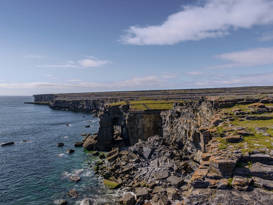 The Atlantic has played a decisive role in shaping the limestone edge of the islands. Along the western coast of Inis Mór in particular, constant wave action has carved dramatic cliffs, collapsing weaker rock and exposing sheer vertical faces above the sea. Storm waves exploit existing cracks and weaknesses in the limestone, gradually undercutting and reshaping the shoreline.